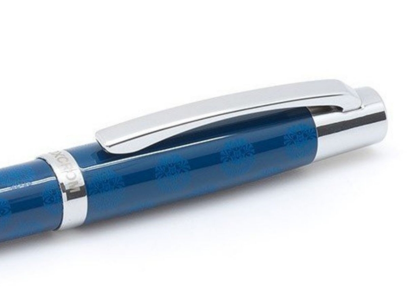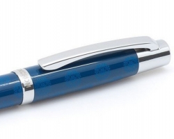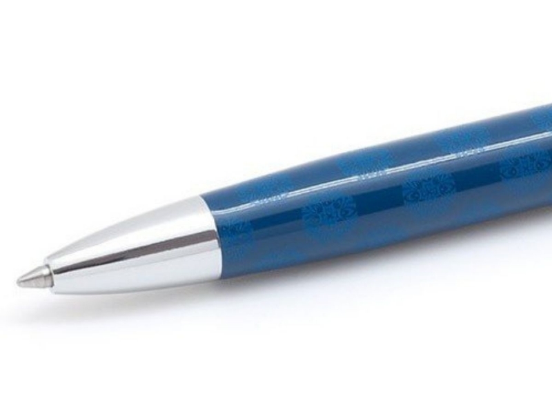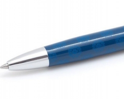 Bolígrafo de cuerpo metálico lacado en azul, grabado en láser con textura Royale y terminales cromados de la marca Inoxcrom que dará ese toque sofisticado y moderno a tus reuniones y eventos importantes.