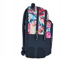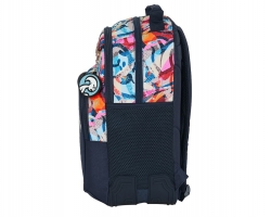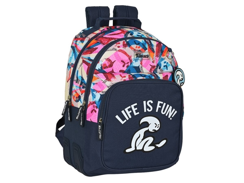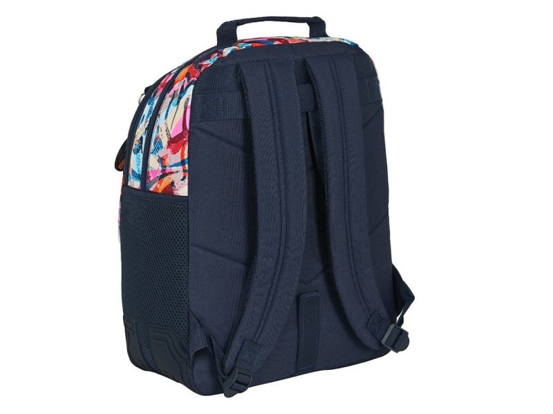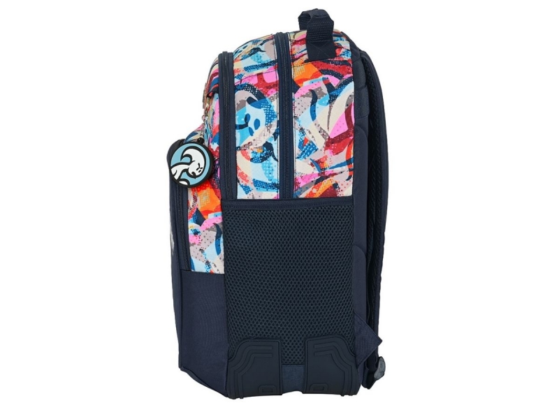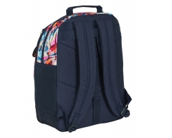 Consta de tres compartimentos grandes para que repartas todo tu material escolar. Los más grandes para libros y el frontal más pequeño para pequeños objetos, tu almuerzo y objetos personales. En los laterales lleva dos bolsillos de rejilla para la botella de agua o el paraguas.