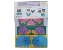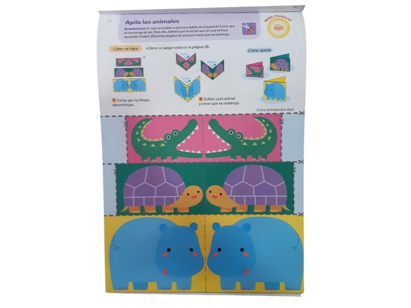 Este cuaderno de Edelvives contiene actividades que refuerzan las habilidades psicomotrices al recortar líneas rectas, curvas y formas pero además, una vez terminada la actividad puedes aprovechar lo que ha hecho para que reconozca los animales, los colores, diferenciar los tamaños de las figuras y contar las cosas que ve.
