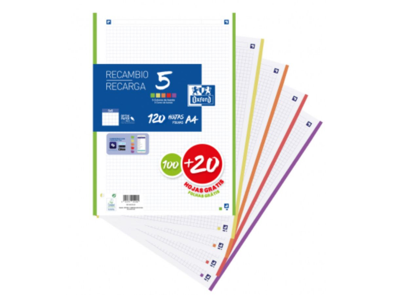 Con los recambios de 5 colores de Oxford podrás organizarte los temas o asignaturas como quieras gracias a sus 5 colores y sus 4 taladros para que luego las puedas archivar.