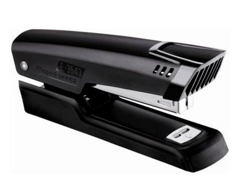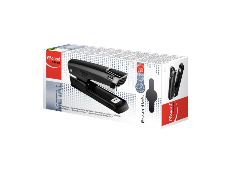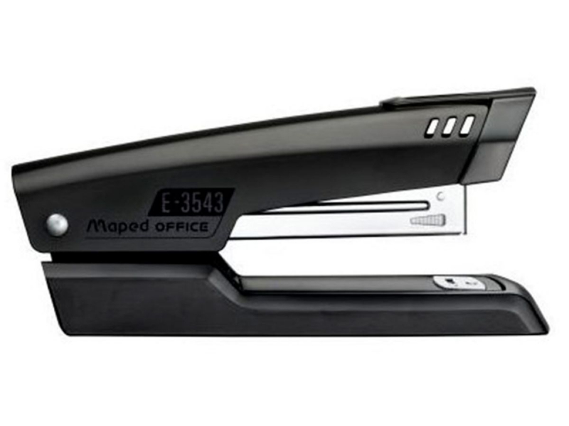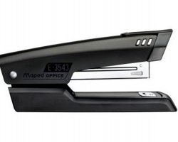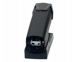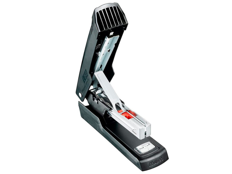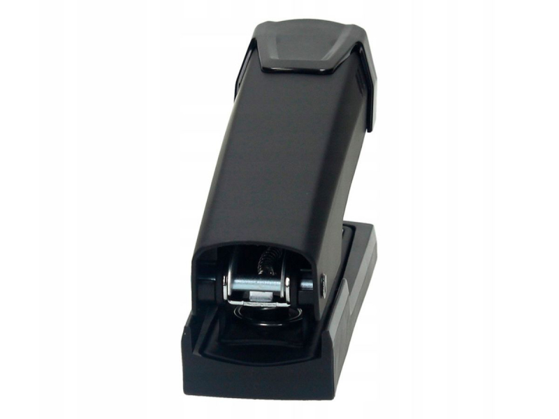 Grapadora metálica con base de plástico y mecanismo metálico.