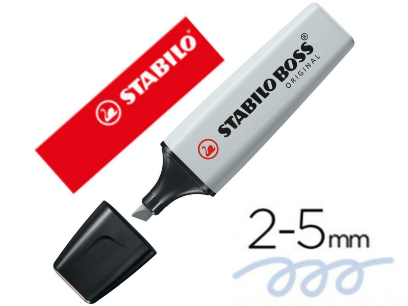 Marcador en color gris pastel de punta biselada con dos anchos de línea, de 2 y 5 mm, lo que te permite marcar varios tamaños de texto o trazar líneas de diferentes grosores.