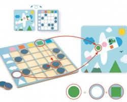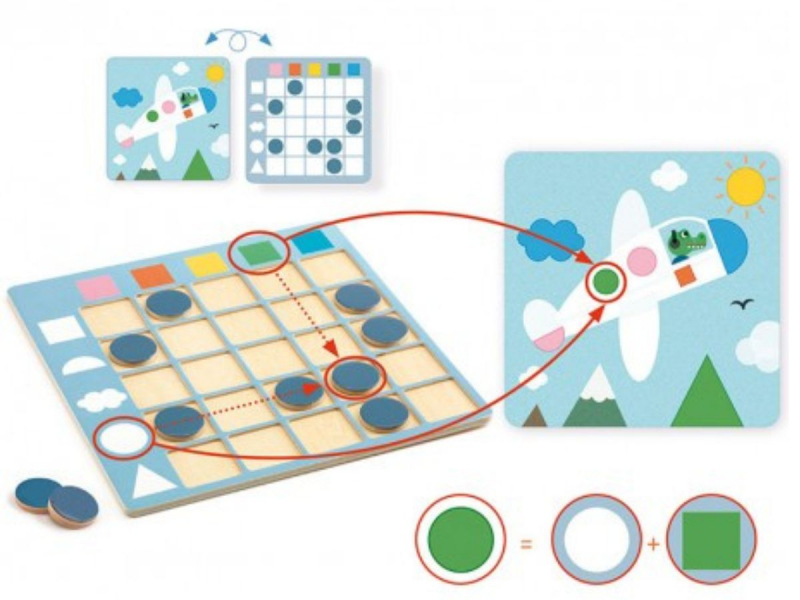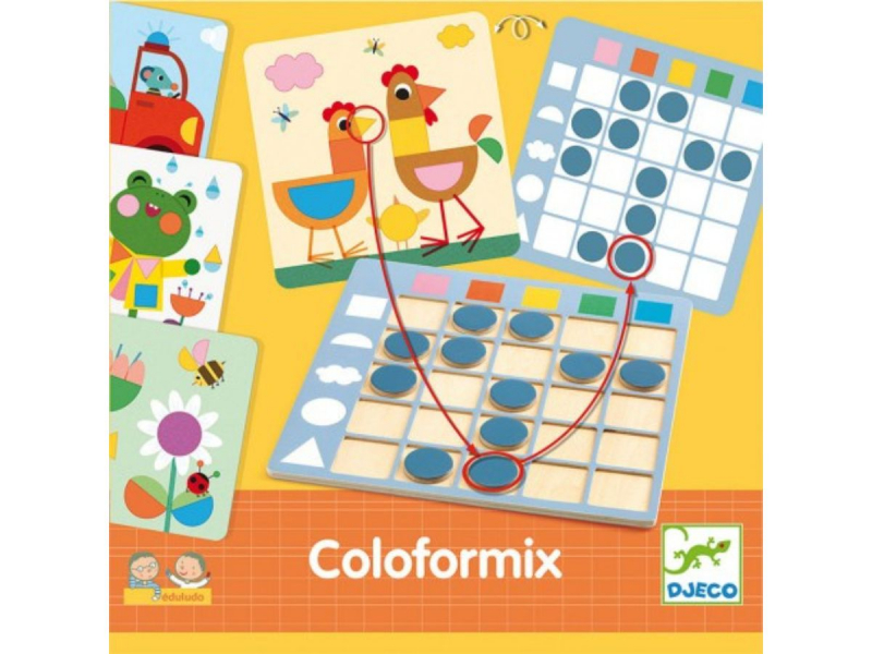 Encuentra cada una de las formas que hay en la imagen en el color correcto y completa el tablero. Da la vuelta a la tarjeta para ver la solución.