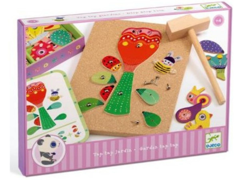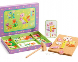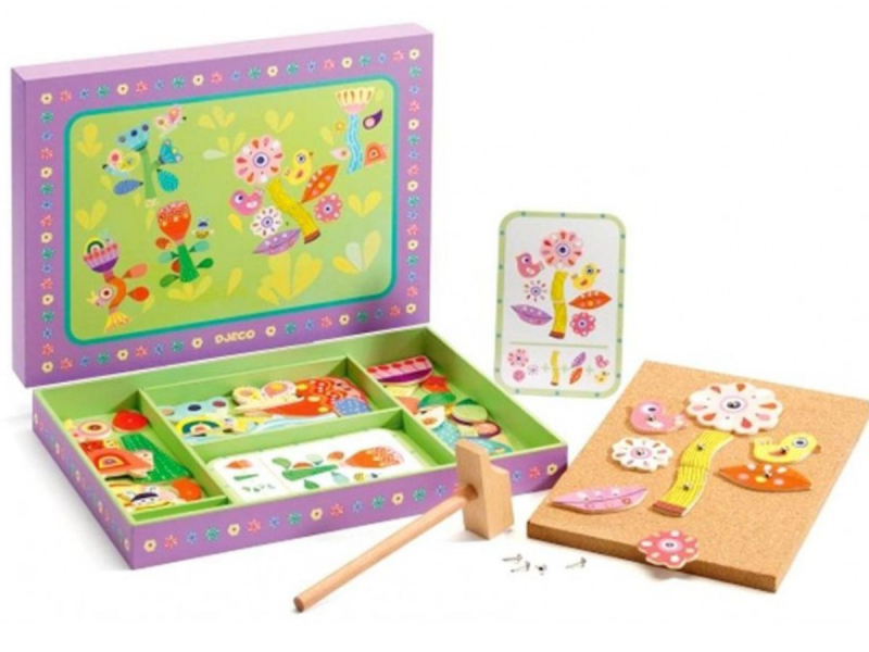 Juego creativo para crear distintos diseños de plantas clavando las piezas de madera con clavos y martillo en el tablero de corcho.