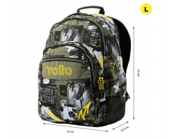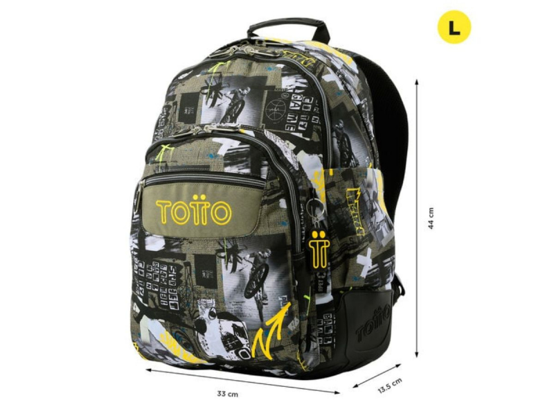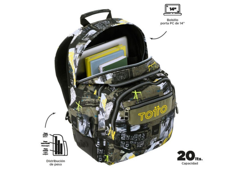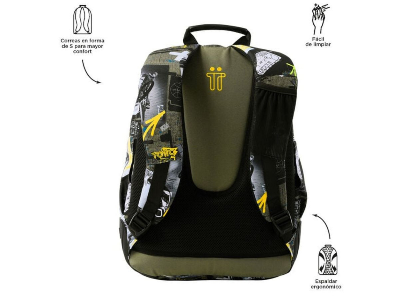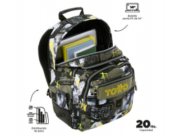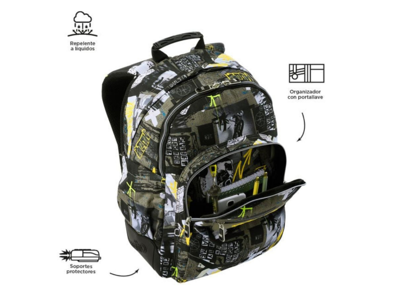 Consta de cuatro compartimentos para que repartas todo tu material escolar. Los dos más grandes son para libros, libretas y objetos grandes. Los dos más pequeños son para tu almuerzo y objetos personales, uno de ellos con organizador.