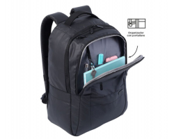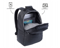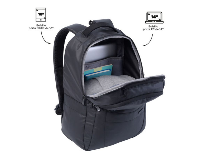 Consta de dos compartimentos. El principal tiene dos bolsillos acolchados para que puedas guardar tu portátil de hasta 14'' y tu tablet de 10''.