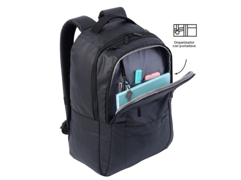 También consta de un compartimento mediano con organizador y un bolsillo pequeño frontal.