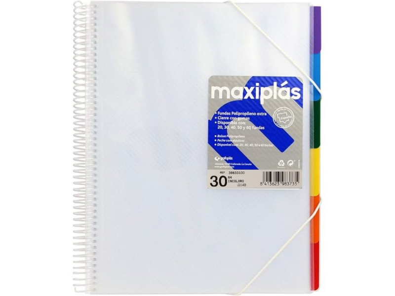 Carpeta de fundas con espiral ideal para tener ordenados tus apuntes y trabajos para tamaño DIN A4 o folio.