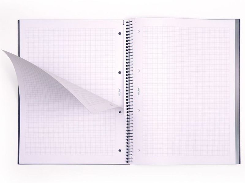 80 hojas de papel cuadriculado de 5x5 microperforadas para arrancarlas y troqueladas para luego poder archivarlas.