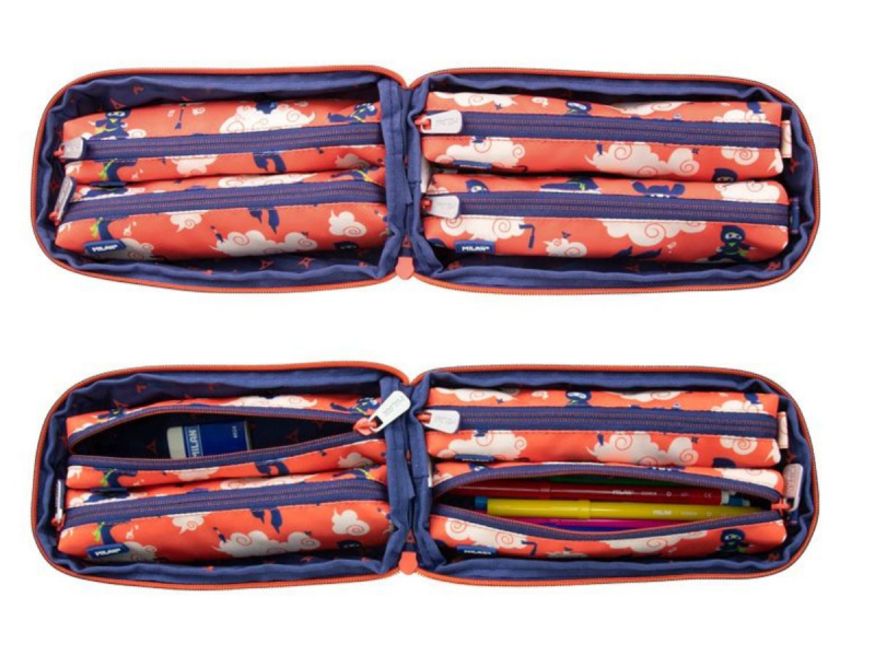 Este plumier consta de 4 compartimentos independientes y extraíbles de cremallera: podrás organizar tu material escolar entre ellos y si lo prefieres podrás sacar es estuche del plumier principal en función del material que necesites.