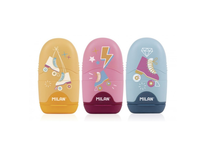 Combinación de goma y sacapuntas con depósito. El sacapuntas tiene una cuchilla de acero al carbono afilada y resistente, ideal para todo tipo de lápices. Su cuchilla dispone de un sistema de seguridad que evita que se pueda separar la hoja del cuerpo del sacapuntas, siendo óptimo para uso escolar.