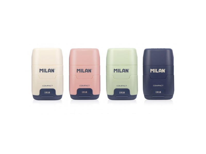 Combinación de goma y sacapuntas doble con depósito. El sacapuntas tiene una cuchilla de acero al carbono afilada y resistente, ideal para todo tipo de lápices. Su cuchilla dispone de un sistema de seguridad que evita que se pueda separar la hoja del cuerpo del sacapuntas, siendo óptimo para uso escolar. Además cambiar la goma es muy sencillo ya que se puede usar la goma milan clásica