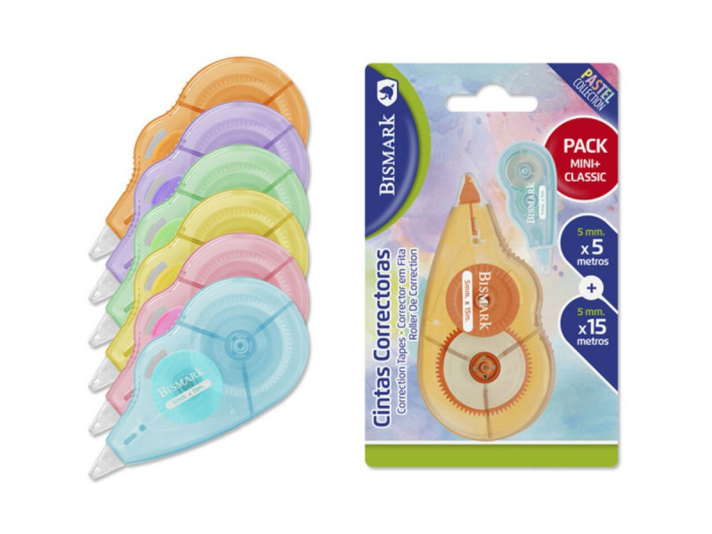 Corrector de cinta pastel de 5mm de ancho y 15 metros de longitud + corrector mini de cinta pastel de 5mm de ancho y 5 metros de longitud. Cinta correctora de secado rápido sobre la que podrás escribir de inmediato.