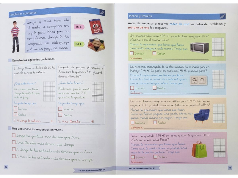 En este cuaderno, el niño/a trabajará problemas matemáticos mediante la lectura de párrafos para mejorar la compresión lectora. Los tres fundamentos que podrá reforzar son: planteamiento, operación y solución
