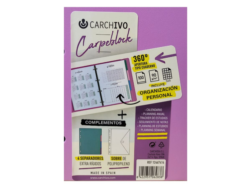 Este archivador fabricado en polipropileno extra rígido y ultra ligero y cierre de goma, para que no se abra dentro de la mochila. Cuenta además con apertura 360º para facilitar el manejo y la escritura. Además trae 4 separadores rígidos, un sobre de polipropileno y un organizador personal perfecto para planificar tareas, las clases... ideal para el día a día del estudiante.