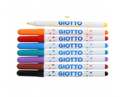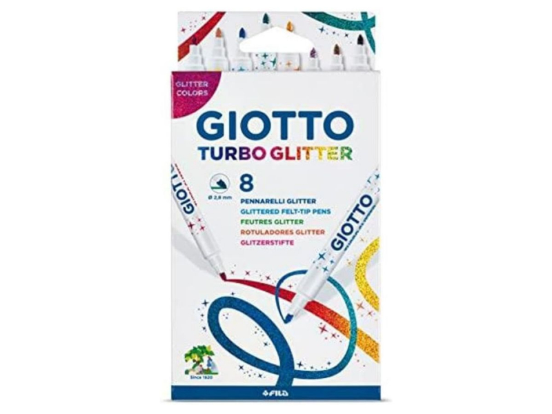 Rotuladores escolares con purpurina de punta de 2,8mm súper resistente, no se retrae. Capuchón ventilado y tapa de seguridad anti-ahogo. La tinta a base de agua es lavable en piel y tejido. Caja con 8 colores surtidos. Recomendado a partir de 5 años.