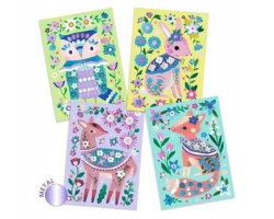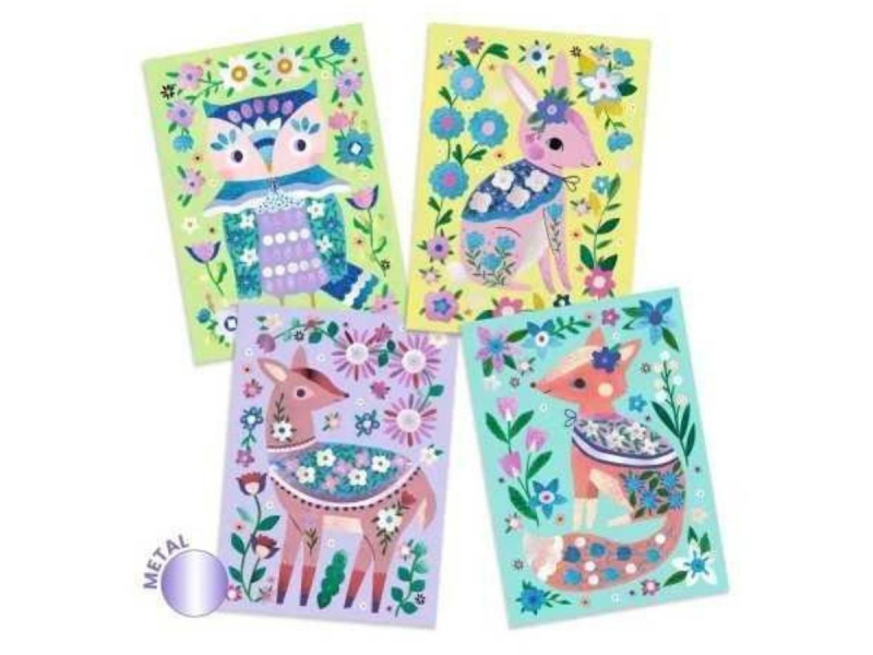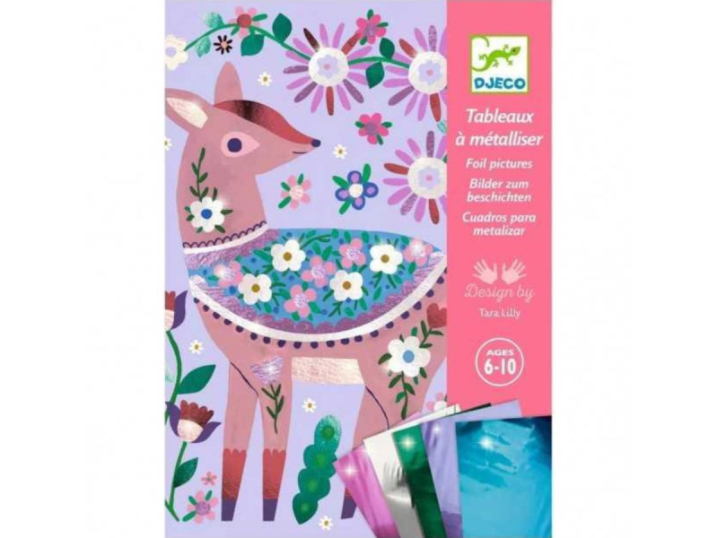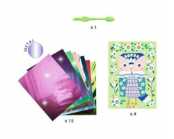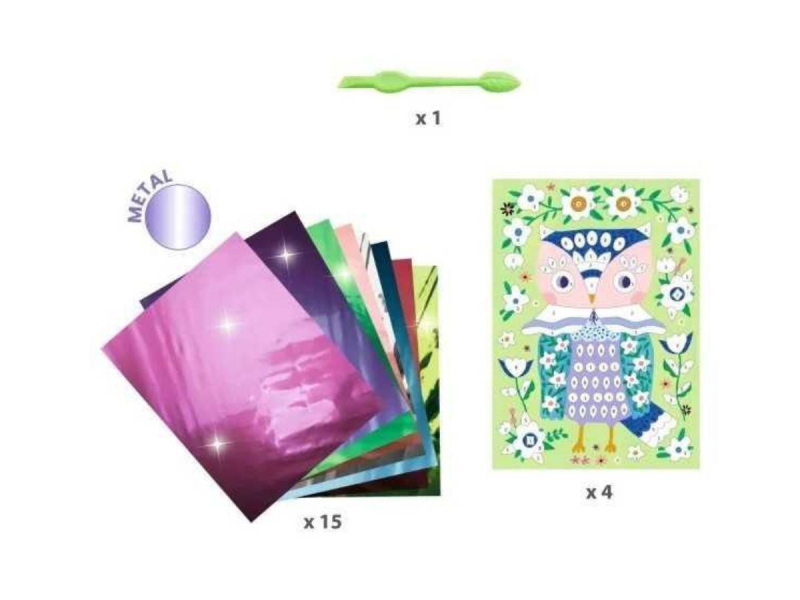 Práctico, el niño utiliza la herramienta incluida para desvelar las superficies encoladas previamente. A continuación, aplica el papel metalizado sobre las zonas indicadas.