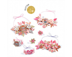 4 juegos de joyas para crear enhebrando flores de papel en tiras elásticas de tela de colores.