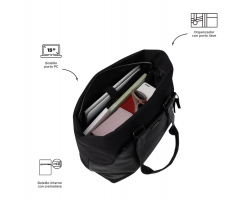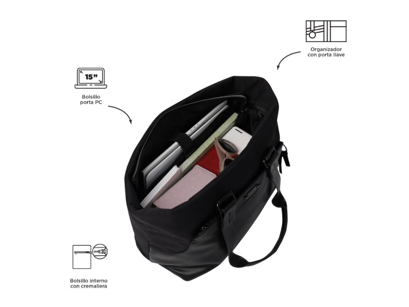 Consta de un compartimento principal en el que guardar los objetos más grandes, con separador para un ordenador de hasta 15 pulgadas y un bolsillo delantero con organizador.