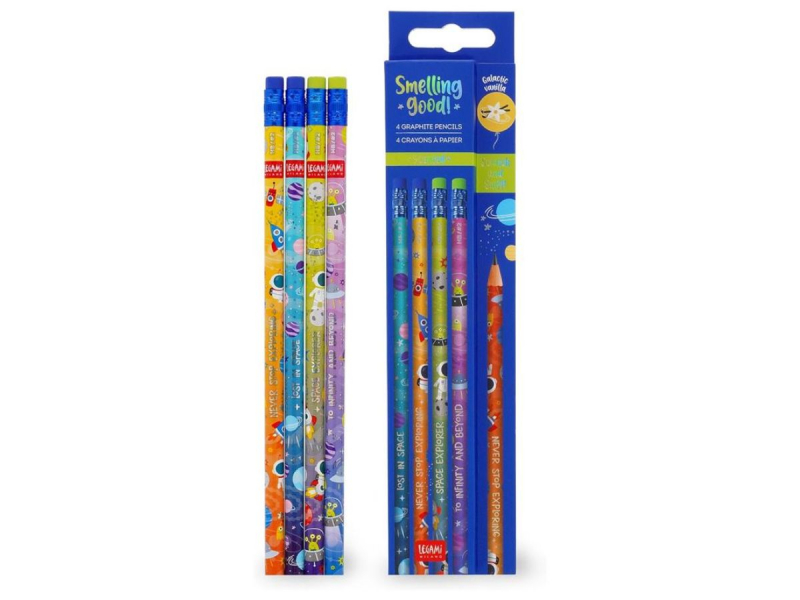 El set de lápices legami cuenta con 4 lápices HB, los clásicos, con estampado espacial. Además gracias a la sutil fragancia a vainilla que desprende los más peques adorarán utilizarlos.