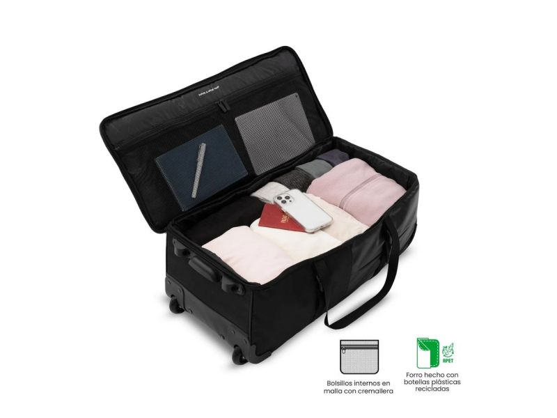 Cuenta con un gran compartimento, ideal para las prendas de mayor volumen como ropa o zapatos, y un separador interior con rejilla para guardar cosas más pequeñas. El bolsillo exterior frontal te aporta más espacios de almacenaje para poder guardar los objetos de uso más inmediato como la cartera, el pasaporte