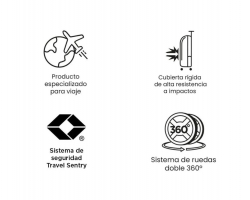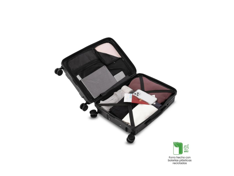 Moverte con ella es muy sencillo ya que viene equipada con ruedas de giro 360º y mango extensible. Además, gracias a los materiales de los que está hecha, como el RPET (botellas plásticas recicladas) y el polipropileno de alta resistencia, presenta un diseño resistente a impactos y respetuoso con el medioambiente.