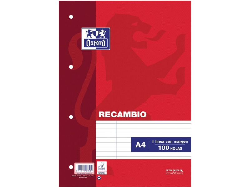 Recambio de 100 hojas gratis, de tamaño A4 para archivador de 4 anillas. Hoja rayada de 90 gr con margen. Papel de calidad optik paper.