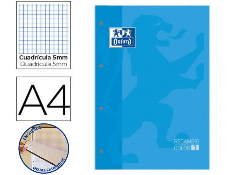 Recambio Oxford encolado de 80 hojas de 90gr con cuadro de 5mm y banda lateral en color azul.