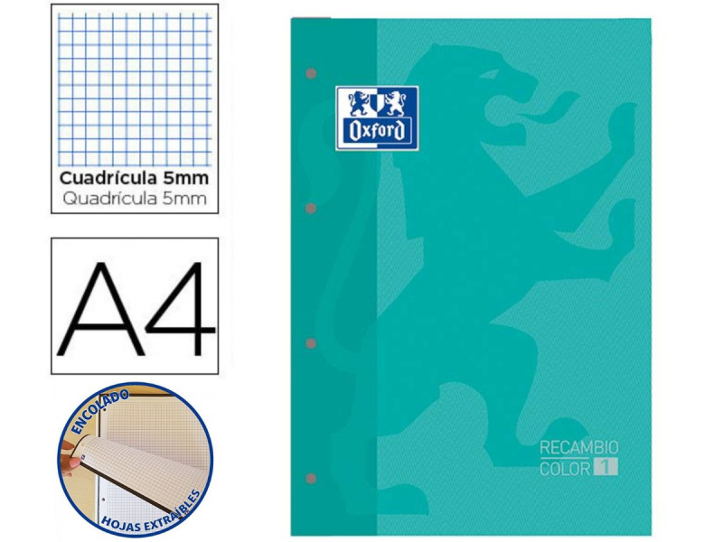 Recambio Oxford encolado de 80 hojas de 90gr con cuadro de 5mm y banda lateral en color verde menta. Puedes utilizarlo como cuaderno o bien para un archivador de 4 anillas.