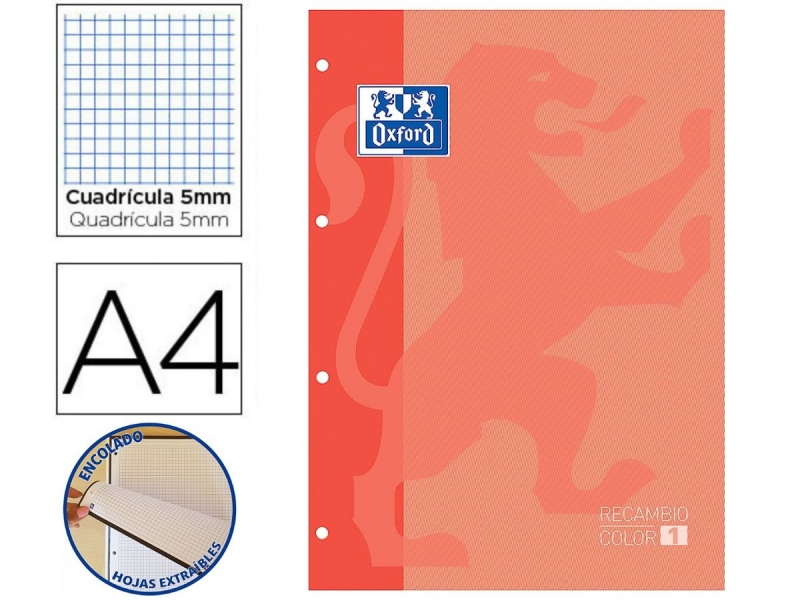Recambio Oxford encolado de 80 hojas de 90gr con cuadro de 5mm y banda lateral en color melocotón. Puedes utilizarlo como cuaderno o bien para un archivador de 4 anillas.