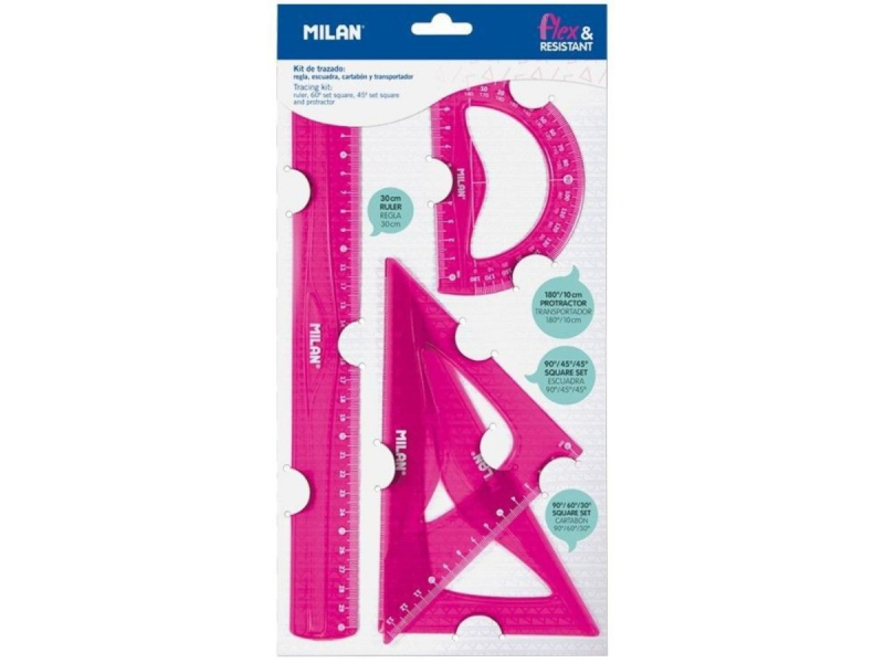 Este kit de dibujo contiene: regla 30 cm, escuadra 90º/45º/45º, cartabón 90º/60º/30º y transportador 180º 10 cm. Color fucsia translúcido. Material flexible y resistente.