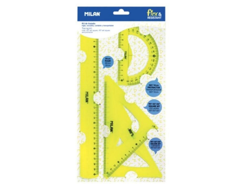 Este kit de dibujo contiene: regla 30 cm, escuadra 90º/45º/45º, cartabón90º/60º/30º y transportador 180º 10 cm. Color amarillo translúcido. Material flexible y resistente.