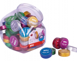 Esta cinta adhesiva de purpurina opaca mide 15mm de ancho x 5m de largo.