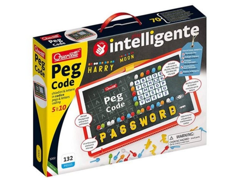 Clavitos y letras para escribir mensajes secretos de descifrar con el nuevo Peg Code. Inventa una palabra secreta y vuelve a escribirla en código, usando el peculiar alfabeto hecho por clavitos coloreados. Puedes retar a tus amigos para ver quien decodifique el código primero.