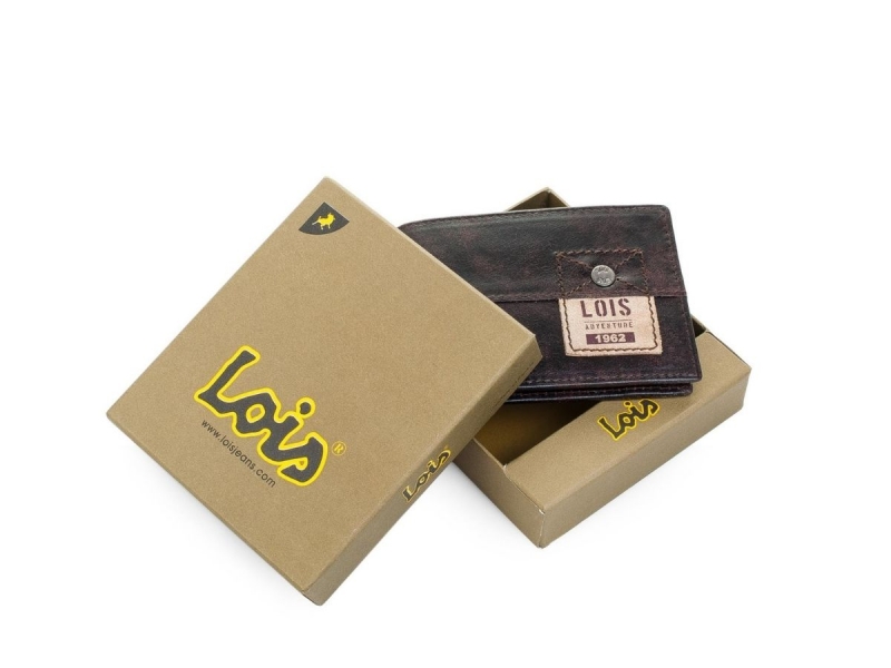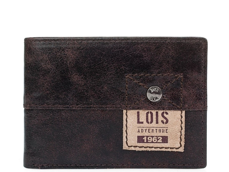 Cartera horizontal para hombre de la marca LOIS, fabricada en piel con efecto envejecido y un parche marrón con el logo de la marca impreso en la parte delantera.