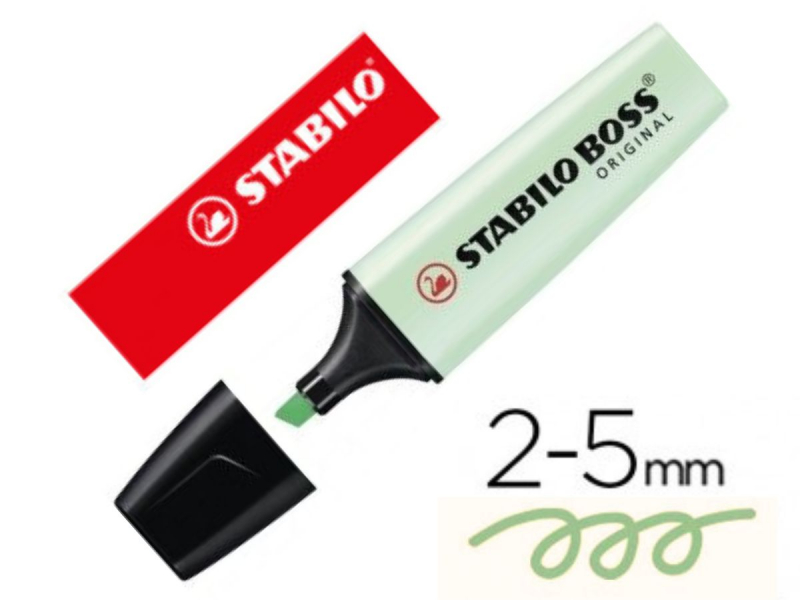 Marcador en color verde menta pastel de punta biselada con dos anchos de línea, de 2 y 5 mm, lo que te permite marcar varios tamaños de texto o trazar líneas de diferentes grosores.