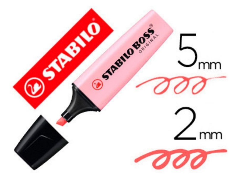 Marcador stabilo color rosa pastel, de punta biselada con dos anchos de línea, de 2 y 5 mm, lo que te permite marcar varios tamaños de texto o trazar líneas de diferentes grosores.
