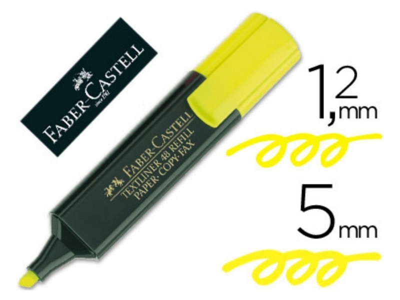 Marcador Faber Castell color amarillo superfluorescente con tinta a base de agua y punta biselada, lo que te permite marcar con 3 tipos de trazo, de 1mm,,2mm y 5mm.