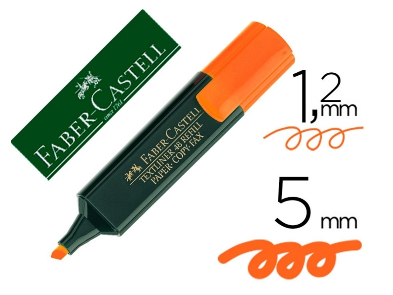 Marcador Faber Castell color naranja superfluorescente con tinta a base de agua y punta biselada, lo que te permite marcar con 3 tipos de trazo, de 1mm,,2mm y 5mm.