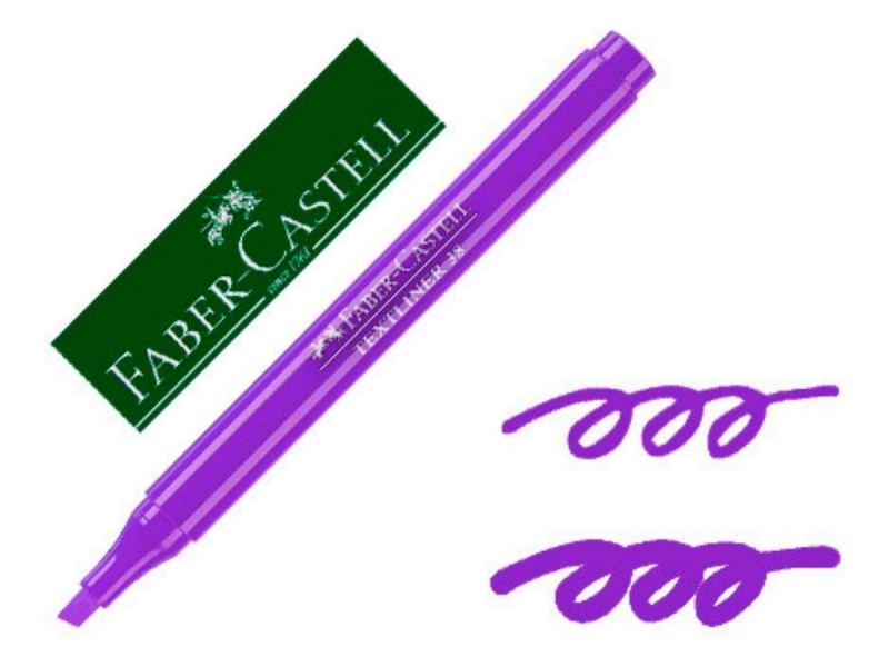Marcador Faber Castell color violeta super-fluorescente con tinta a base de agua y punta biselada, lo que te permite marcar con 2 tipos de trazo, fino y grueso.
