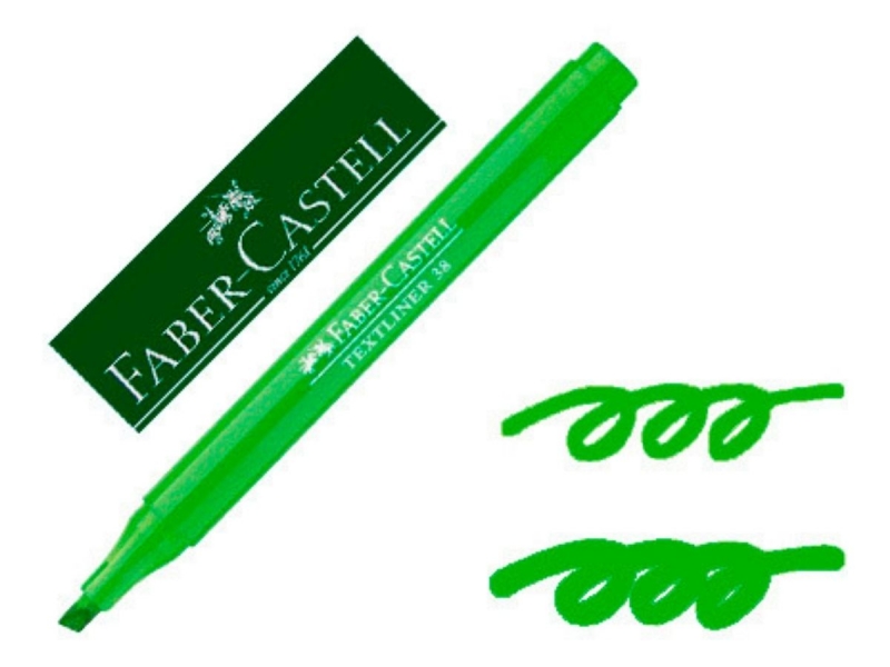 Marcador Faber Castell color verde superfluorescente con tinta a base de agua y punta biselada, lo que te permite marcar con 2 tipos de trazo, fino o grueso.
