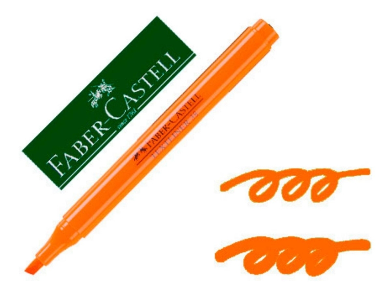 Marcador Faber Castell color naranja super-fluorescente con tinta a base de agua y punta biselada, lo que te permite marcar con 2 tipos de trazo, fino o grueso.