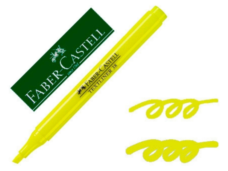 Marcador Faber Castell color amarillo super-fluorescente con tinta a base de agua y punta biselada, lo que te permite marcar con 2 tipos de trazo, fino o grueso.