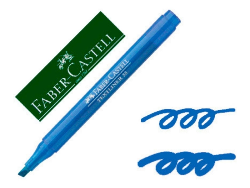 Marcador Faber Castell color azul super-fluorescente con tinta a base de agua y punta biselada, lo que te permite marcar con 2 tipos de trazo, fino y grueso.