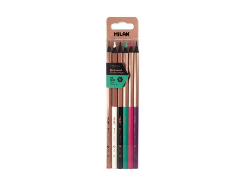Lápices de colores con mina de gran grosor (3,5mm diámetro) y cuerpo en color cobre. Ideales para regalo.